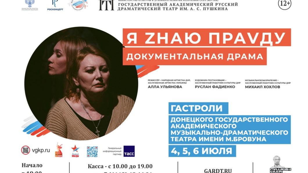 4, 5, 6 июля на сцене Русского театра пройдут гастроли Донецкого государственного академического музыкально-драматического театра имени М.М. Бровуна с документальной драмой «Я Zнаю праVду» (16 +). Продолжительность — 1 час 6 минут без антракта.