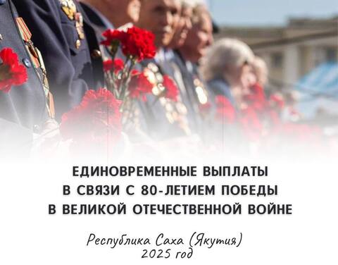 Согласно Указу Главы Якутии, в год празднования 80-летия Великой Победы предусмотрены единовременные выплаты: жителям блокадного Ленинграда, бывшим несовершеннолетним узникам концлагерей, гетто, вдовам участников войны – в размере 80 тысяч рублей, труженикам тыла – 50 тысяч рублей, а также детям войны — 5 тысяч рублей. Все выплаты будут произведены до 20 февраля в беззаявительном порядке.