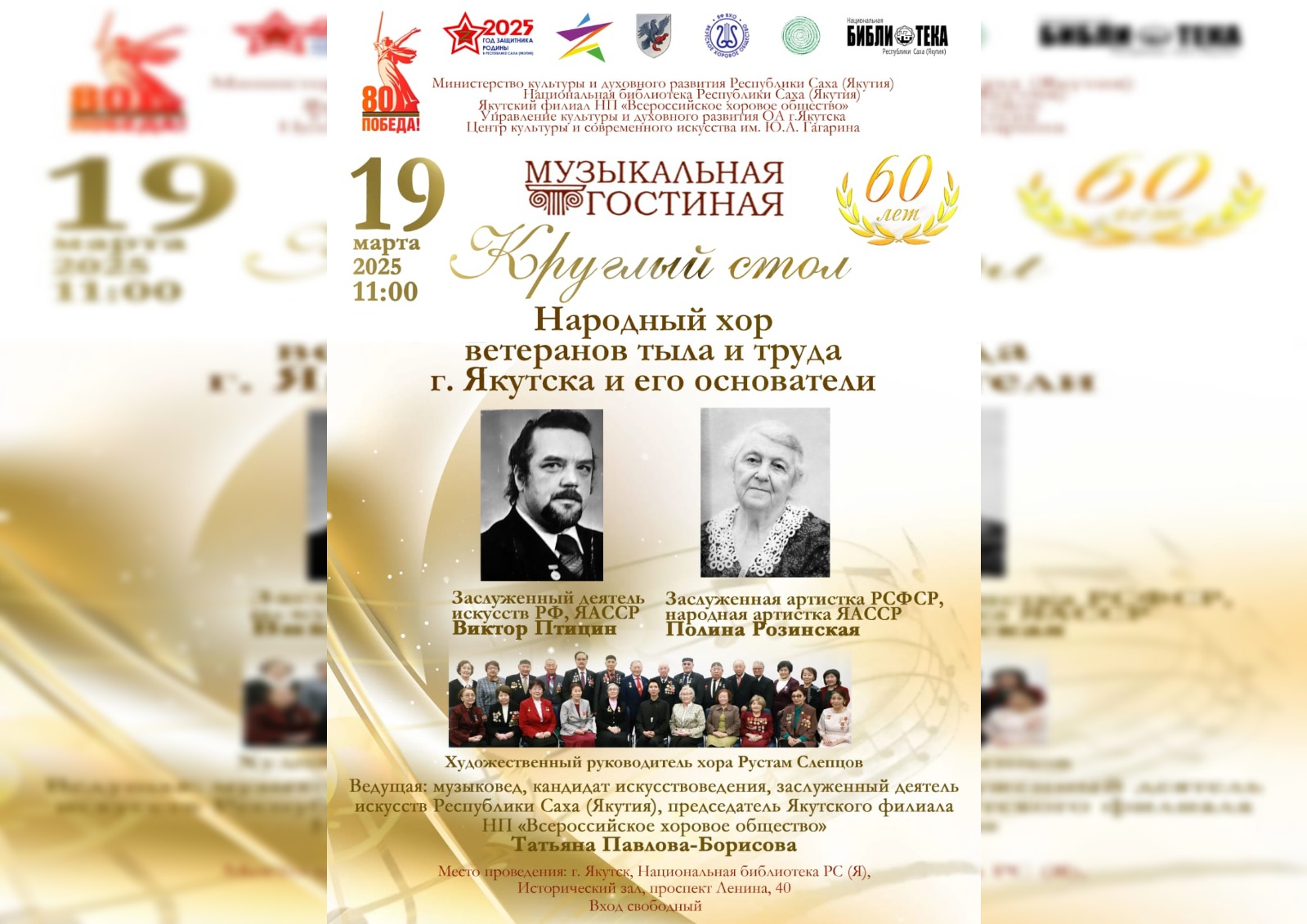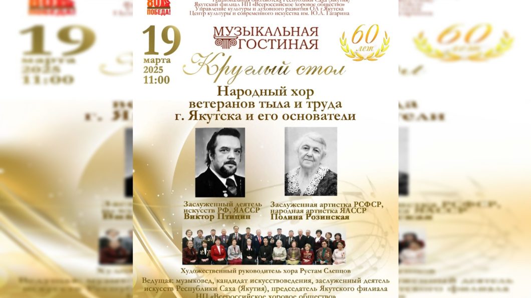 19 марта в Историческом зале Национальной библиотеки РС(Я) состоится круглый стол «Народный хор ветеранов тыла и труда города Якутска и его основатели — заслуженная артистка РСФСР Полина Розинская и заслуженный деятель искусств РФ и ЯАССР Виктор Птицин» (12+), приуроченный к 60-летнему юбилею коллектива, 80-летию Великой Победы.