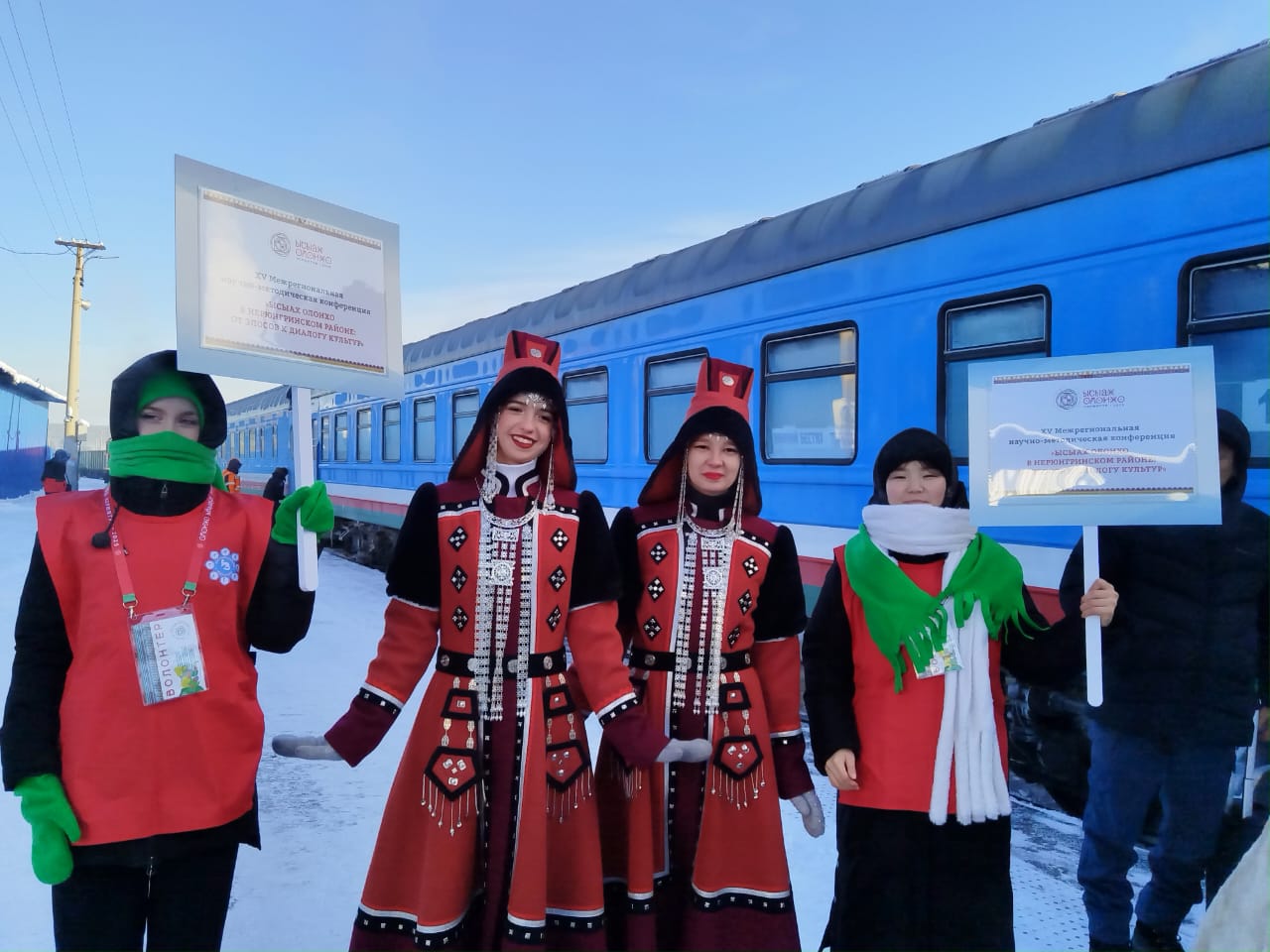 18 часов в поезде пролетели незаметно под душевные разговоры в купе и чай из стаканов с фирменными подстаканниками. Многие ехали в Южную Якутию впервые, в том числе и автор строк, оттого было волнительно, как же встретит нас местное население. Но как только мы спустились на перрон, все волнение как рукой сняло: девушки-волонтеры в национальных якутских костюмах с приветственными табличками встретили участников конференции и проводили вновь прибывших на площадь перед железнодорожным вокзалом станции Нерюнгри. Встретили нас с хлебом-солью, оладьями и кумысом, и тут же все закружились в осуохае.