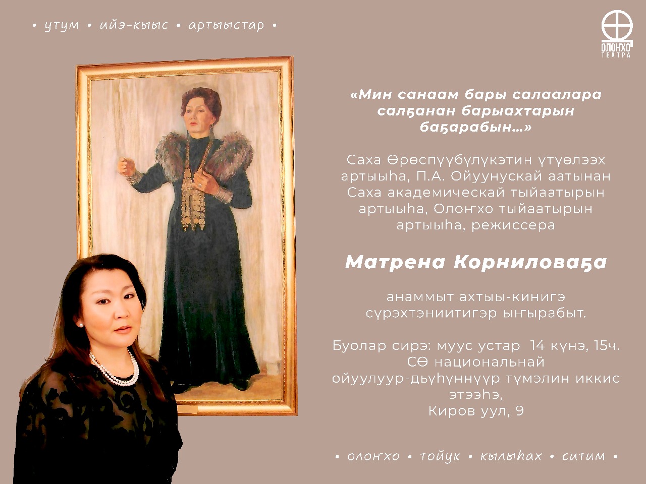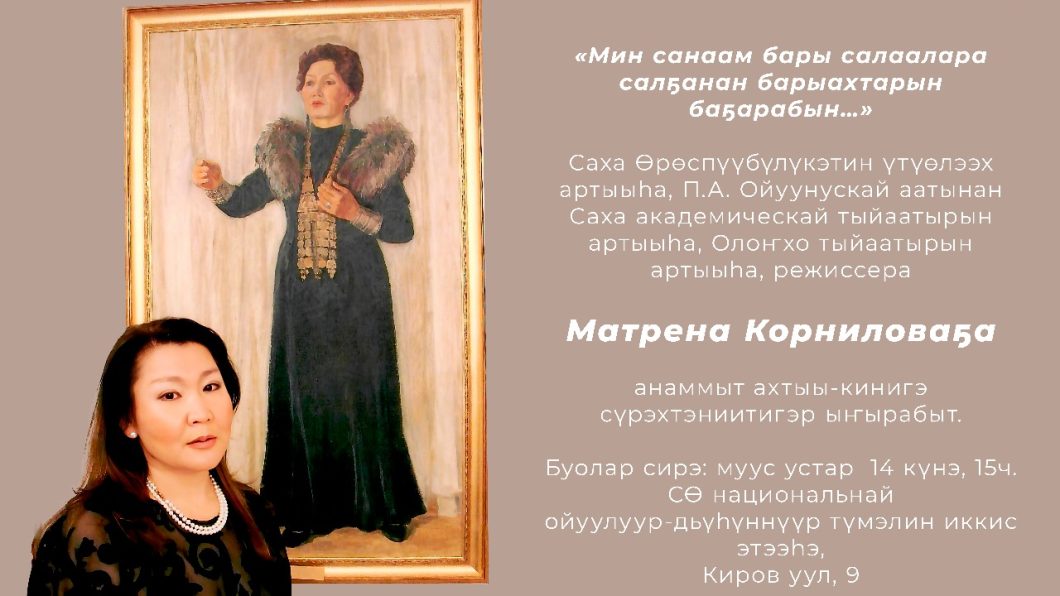 Матрена Владимировна Корнилова (1962-2019), закончив в 1985 году Высшее театральное училище имени М.С.Щепкина, вышла на сцену Саха театра, с 2012 года — по совместительству актриса и режиссер Театра Олонхо. Снималась в фильмах «Срединный мир», «Белый ягель», «Иччи».