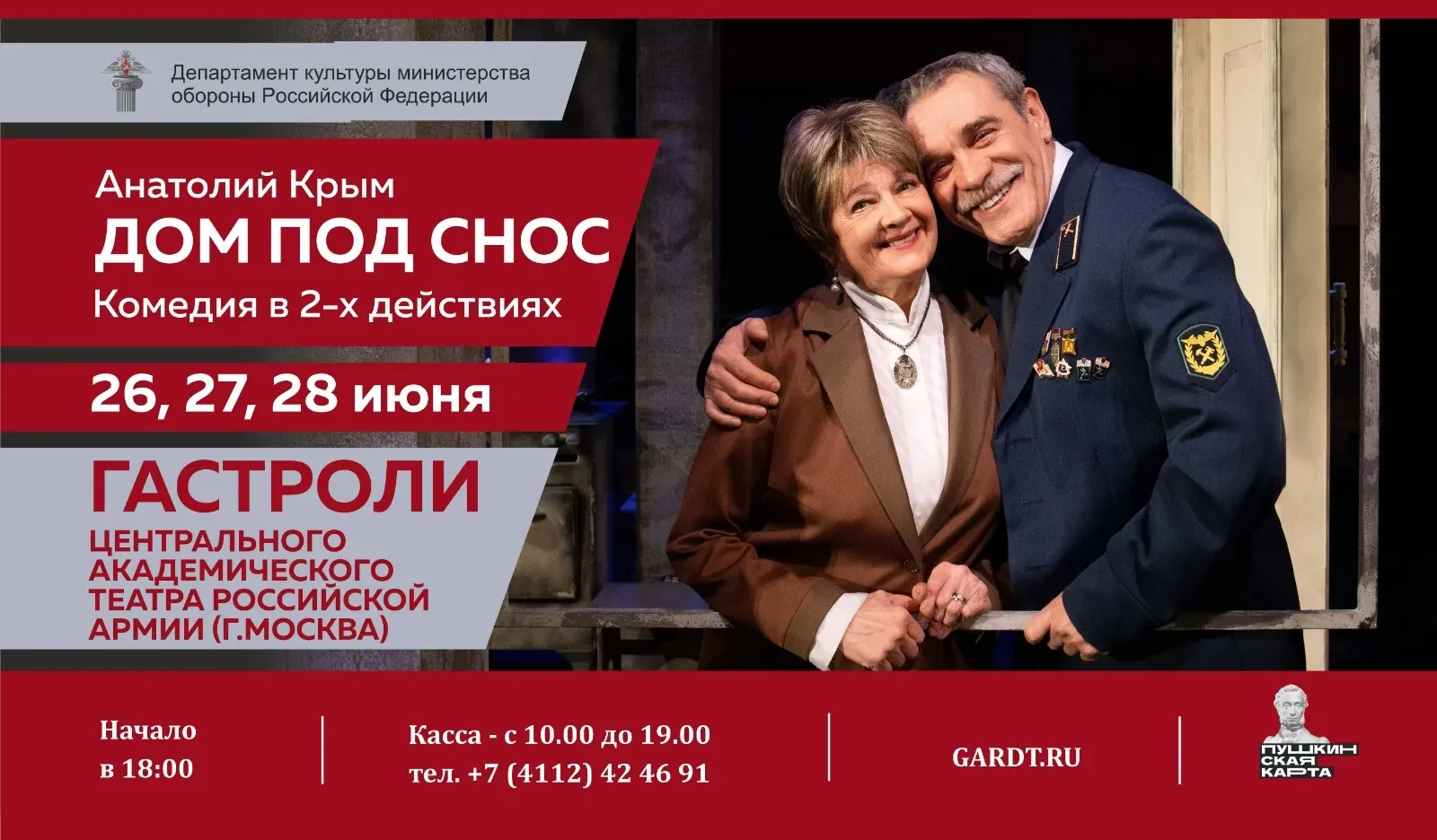 В течение трех дней, с 26 по 28 июня, жители и гости Якутска смогут увидеть в Русском театре постановку Центрального академического театра российской армии «Дом под снос» режиссера Андрея Байдулина по пьесе Анатолия Крыма. Возрастной ценз — 16+. Главные роли в спектакле сыграют народная артистка РСФСР Алина Покровская, которую мы все прекрасно знаем по легендарному фильму «Офицеры» и заслуженный артист России Сергей Колесников. Начало — в 18 часов.