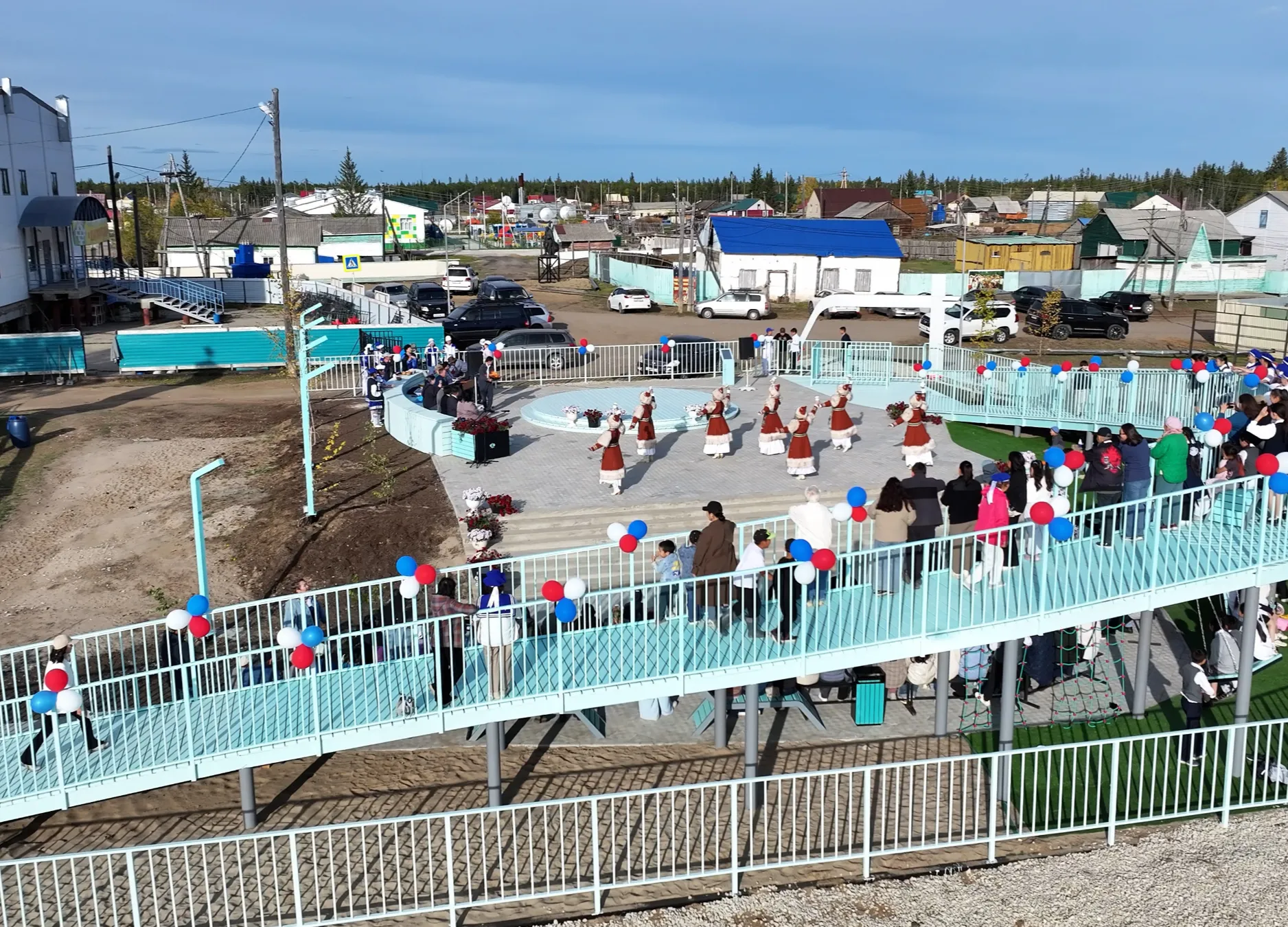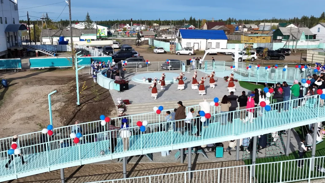 Центральным элементом благоустройства стала событийная зона со сценой и амфитеатром. Для детей обустроена современная площадка с песочницей и канатным комплексом. Важной точкой притяжения стала многофункциональная смотровая площадка с качелями, выполненная в форме изгибов реки Вилюй.