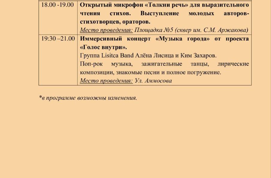 Начало: в 11:00. А вечером с 19:00 пройдет иммерсивный концерт «Музыка города» от «Голос внутри» — группы Lisitca Band Алены Лисица и Кима Захарова.