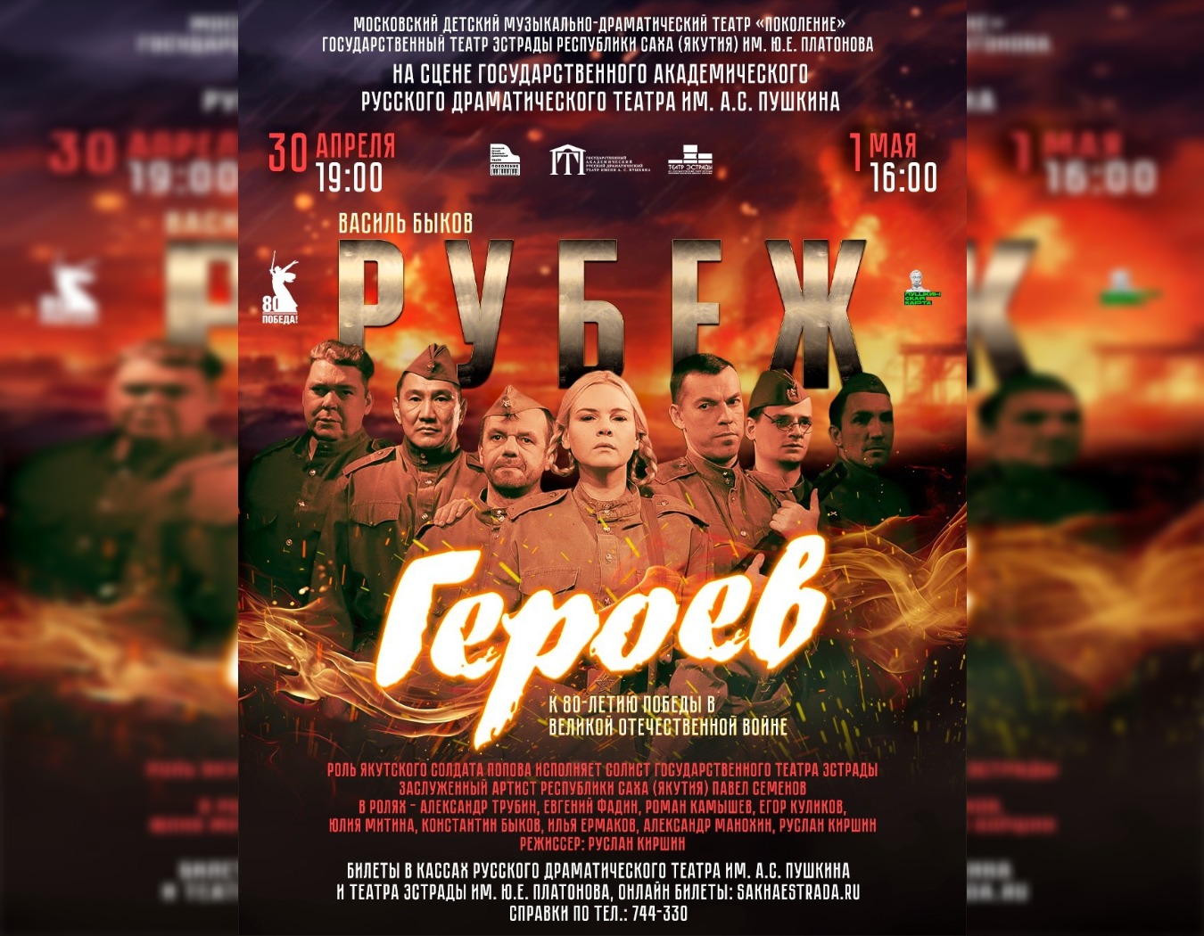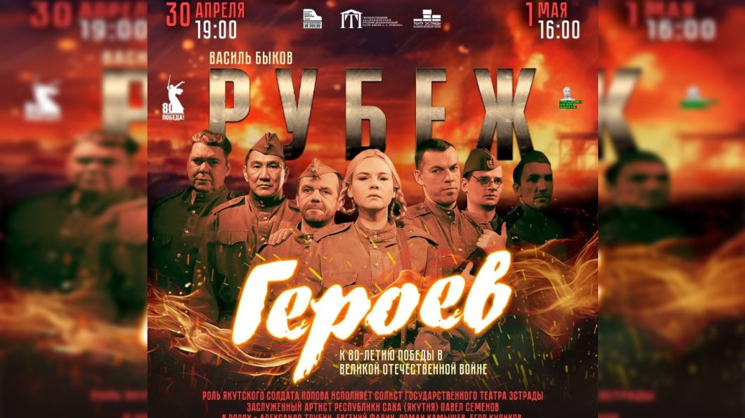 Стартовала продажа билетов на спектакль Московского детского музыкального театра «Поколение» «Рубеж героев» (6+), который покажут в Якутске 30 апреля и 1 мая. Одну из главных ролей в нем сыграл солист Театра эстрады, заслуженный артист РС(Я) Павел Семёнов.