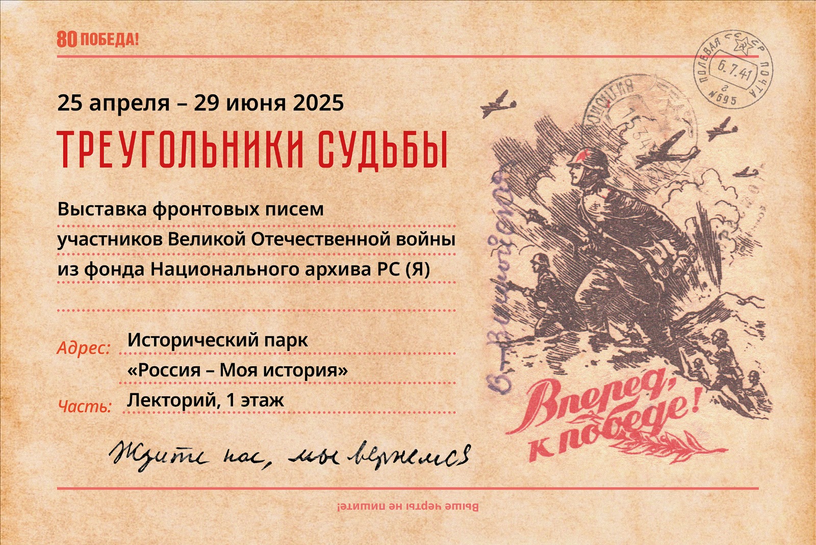 В следующий четверг, 25 апреля, в три часа дня, в лектории на первом этаже исторического парка «Россия – Моя история» откроется выставка «Треугольники судьбы». Мероприятие приурочили к юбилею Победы.