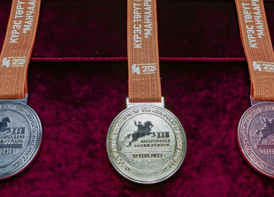 Медаль тренера весом 146 граммов украшена символом-оберегом «5 харах», на медали абсолютного победителя – 11 лучей и камней, символизирующих виды национального спорта, ее вес составит 315 граммов.