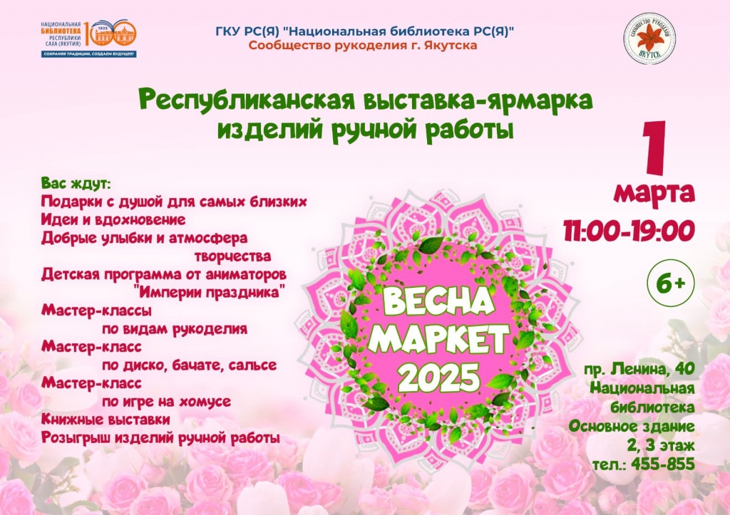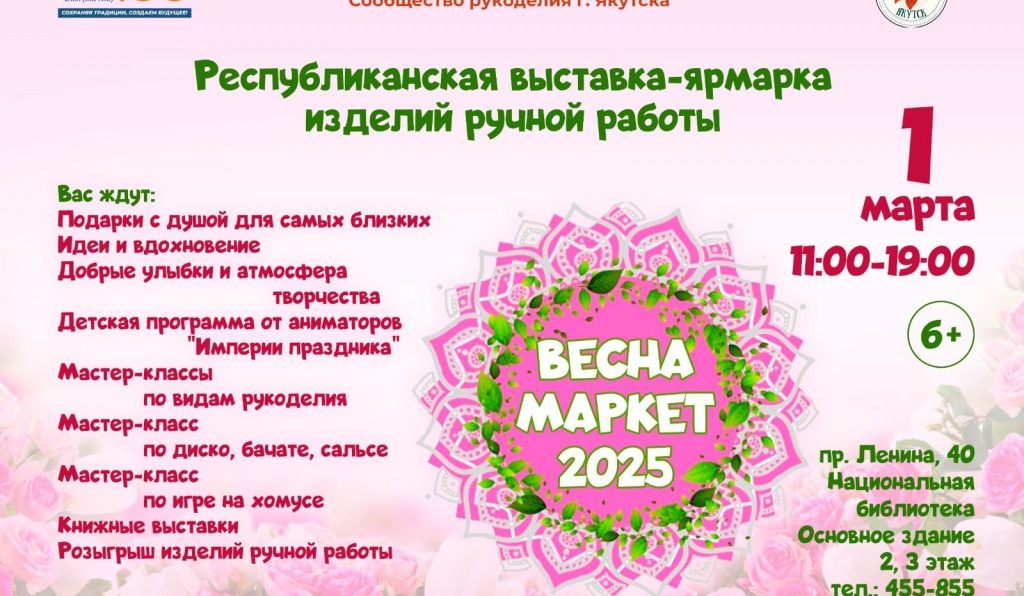 1 марта Национальная библиотека РС(Я) и Сообщество рукоделия города Якутска приглашают на Республиканскую выставку-ярмарку изделий ручной работы «ВЕСНАМАРКЕТ-2025» (6+).