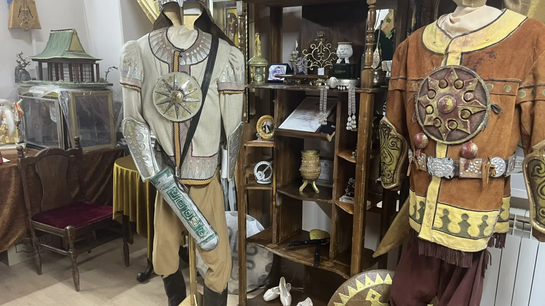 Затем мы посетили Музей театра. Он совсем небольшой, зато здесь хранятся очень ценные экспонаты. В их числе как раз те, о которых мы писали ранее: дэйбиир, а также рог и термос Суоруна Омоллоона, скрипка Гранта Григоряна, бумажный зонт Аи Яковлевой. А также костюм Ньургун Боотура, в котором выступал в 1977 году оперный певец Иван Степанов, костюм первой якутской профессиональной балерины Евдокии Степановой, тросточка и подсвечник оперного певца Матвея Лобанова и много-много других.