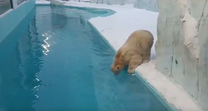 Медвежонок Вилюй освоился и купается в бассейне