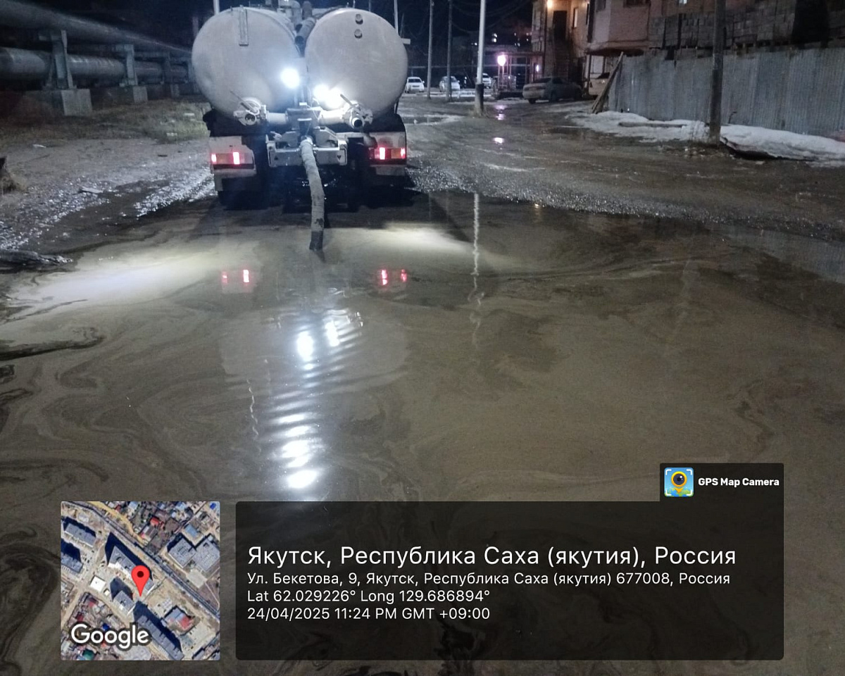 Параллельно активно работали подрядные организации, координируемые Территориальными органами управления (ТОУ). 24 апреля они откачали более 5 839 кубометров талой воды, совершив порядка 60 рейсов в день. Объем откачанной воды с начала интенсивных работ 6 апреля по 24 апреля достиг более 55 431 кубометра. К 24 апреля 2025 года общий объем откачанной воды по Якутску превысил 79 228 кубометров.