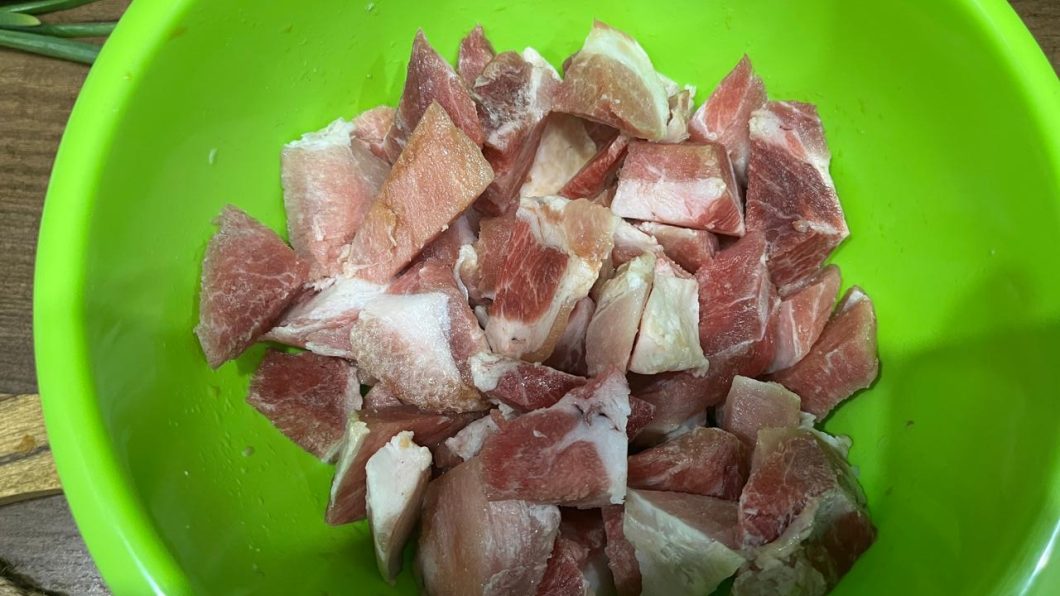 Подготовим все продукты для приготовления свинины в кисло-сладком соусе. Свинину нарежем кусочками, размером чуть меньше, чем спичечный коробок. Выложим нарезанное мясо в миску, зальем 1 ч. л. рисового уксуса и 3 ч. л. соевого соуса. Примечание: в оригинальном рецепте говорилось об одной чайной ложке соевого соуса, однако нам понадобилось в три раза больше – и даже этого показалось мало. Перемешаем мясо и оставим минут на 10 мариноваться.