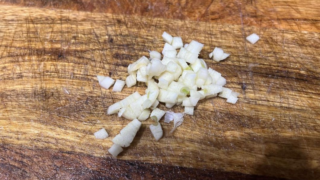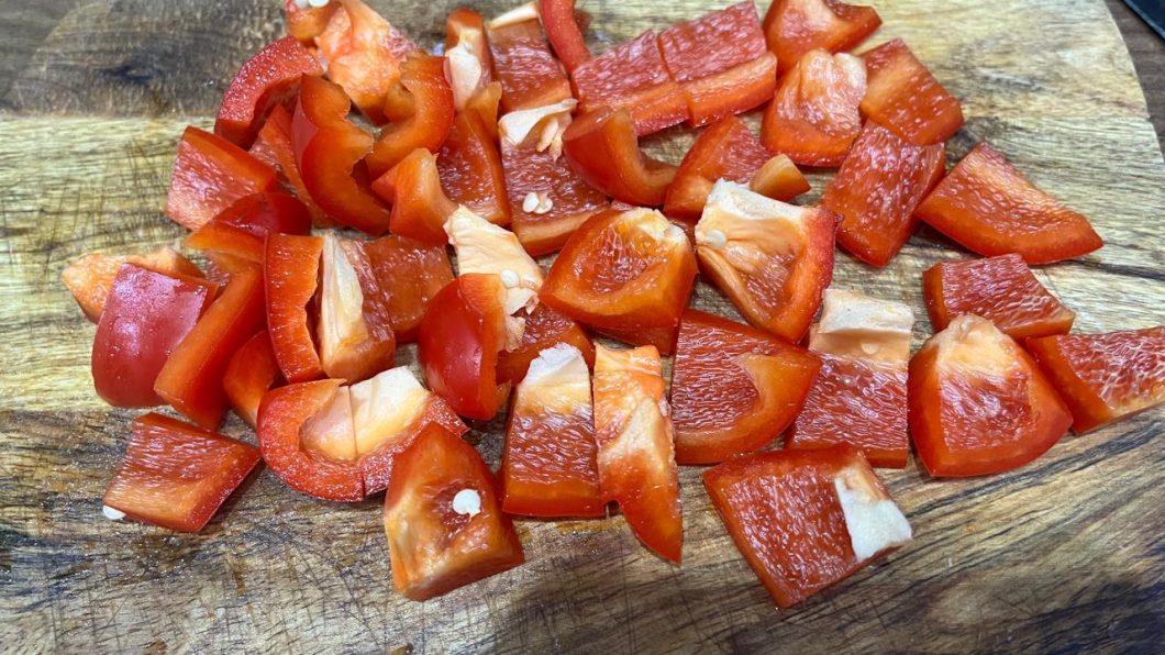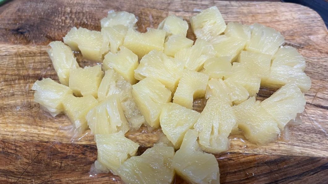 Сладкий перец нарежем крупными кубиками, удалив предварительно плодоножку и семена. Выльем из банки консервированных ананасов сок. Кольца ананасов нарежем кусочками. Репчатый лук и чеснок — мелкими кубиками.
