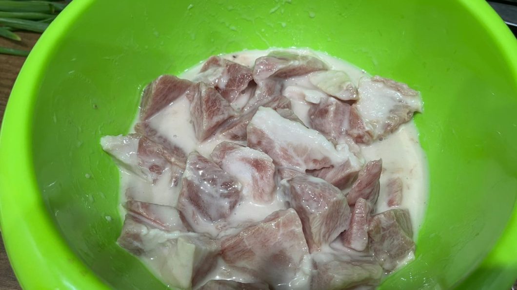 Для кляра смешаем крахмал, соду и соль. Добавим воду и хорошо размешаем кляр до однородной консистенции. Примечание: в оригинале предлагалось использовать только 100 мл воды, но у нас получилась очень твердая глинообразная масса, поэтому пришлось добавить еще 50 мл. Заливаем мясо кляром и хорошо перемешиваем.