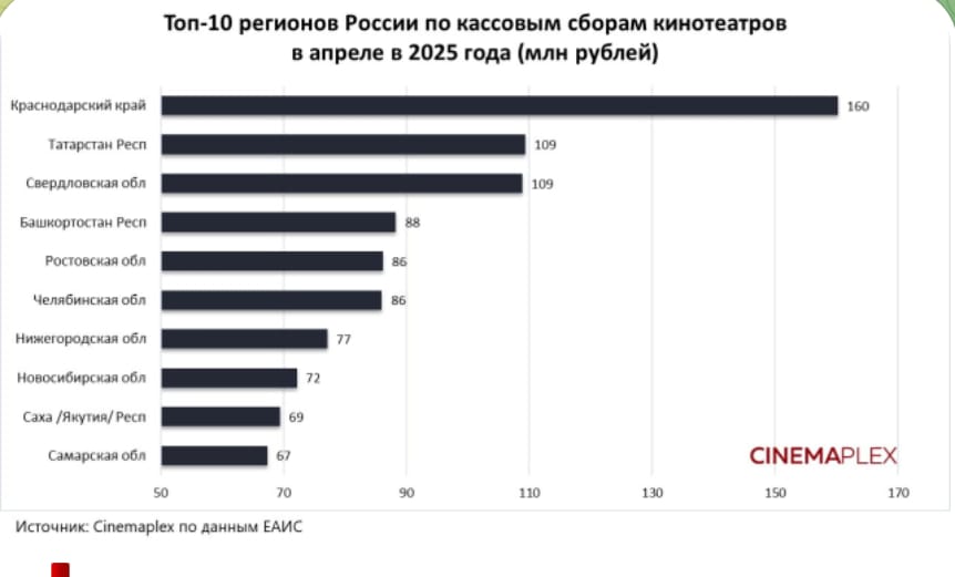 Наша республика впервые вошла в десятку российских регионов по кассовым сборам кинотеатров в апреле 2025 года, сообщает CINEMAPLEX.
