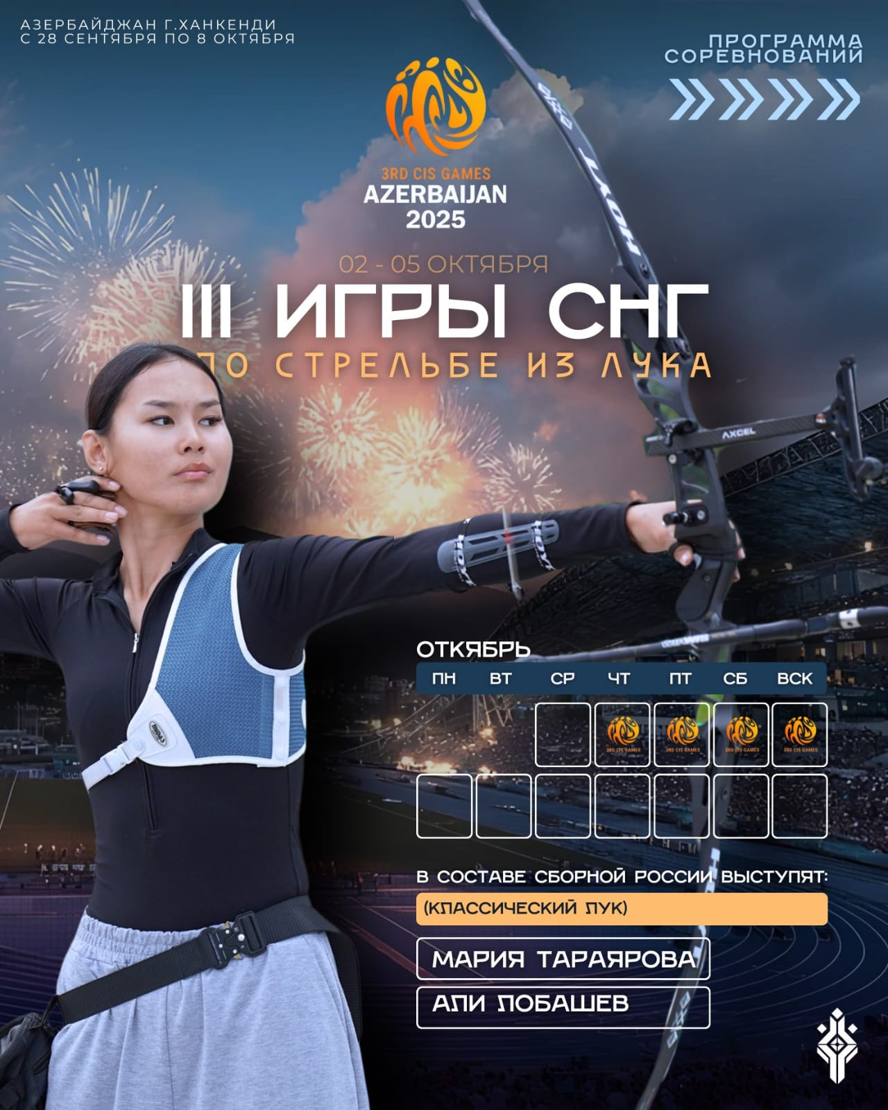 С 2 по 5 октября в городе Ханкеди (Азербайджан) проходят соревнования по стрельбе из лука в рамках III Игр стран СНГ. Сборную России представляют якутские лучники — призёр чемпионата России Мария Тараярова и Али Лобашев.