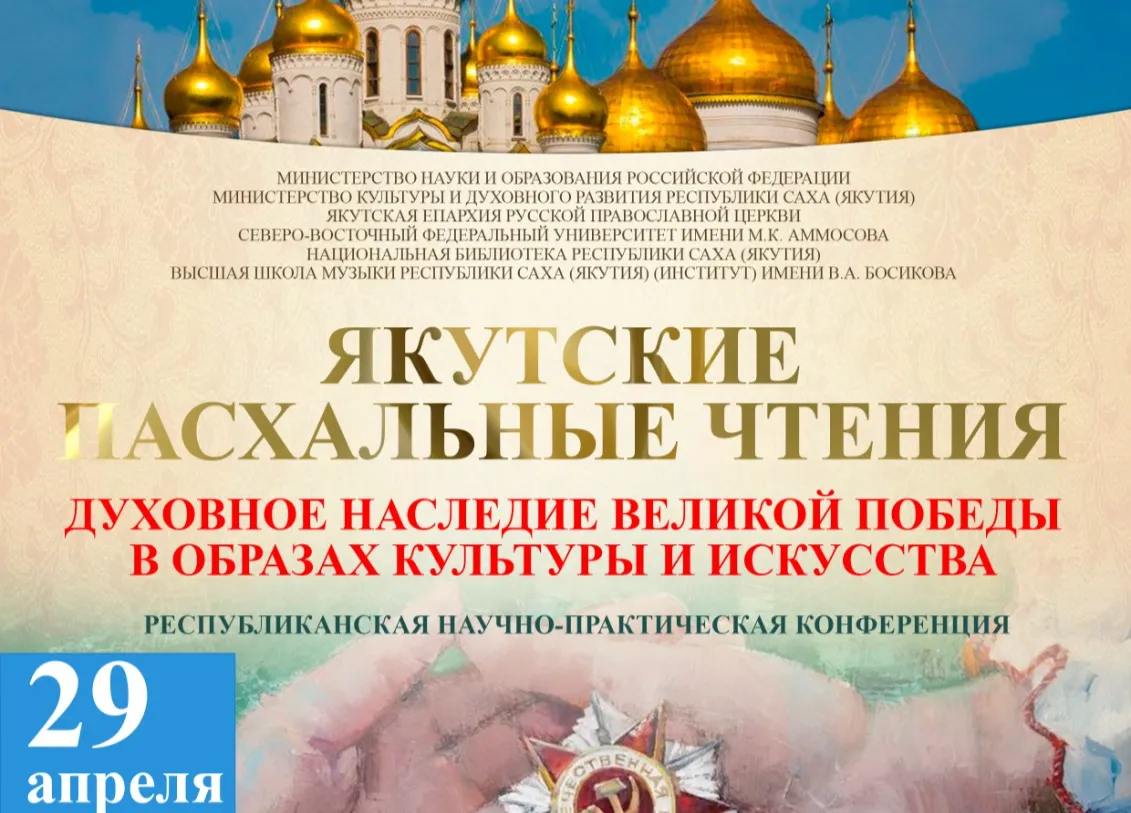 В Историческом зале Национальной библиотеки 29 апреля в 14 часов откроется республиканская научно-практическая конференция «Якутские Пасхальные чтения» на тему «Духовное наследие Великой Победы в образах культуры и искусства». Мероприятие проводится в рамках республиканского Пасхального фестиваля искусств «Золотые купола» и приурочено к Году защитника Отечества, 80-летию Победы в Великой Отечественной войне.