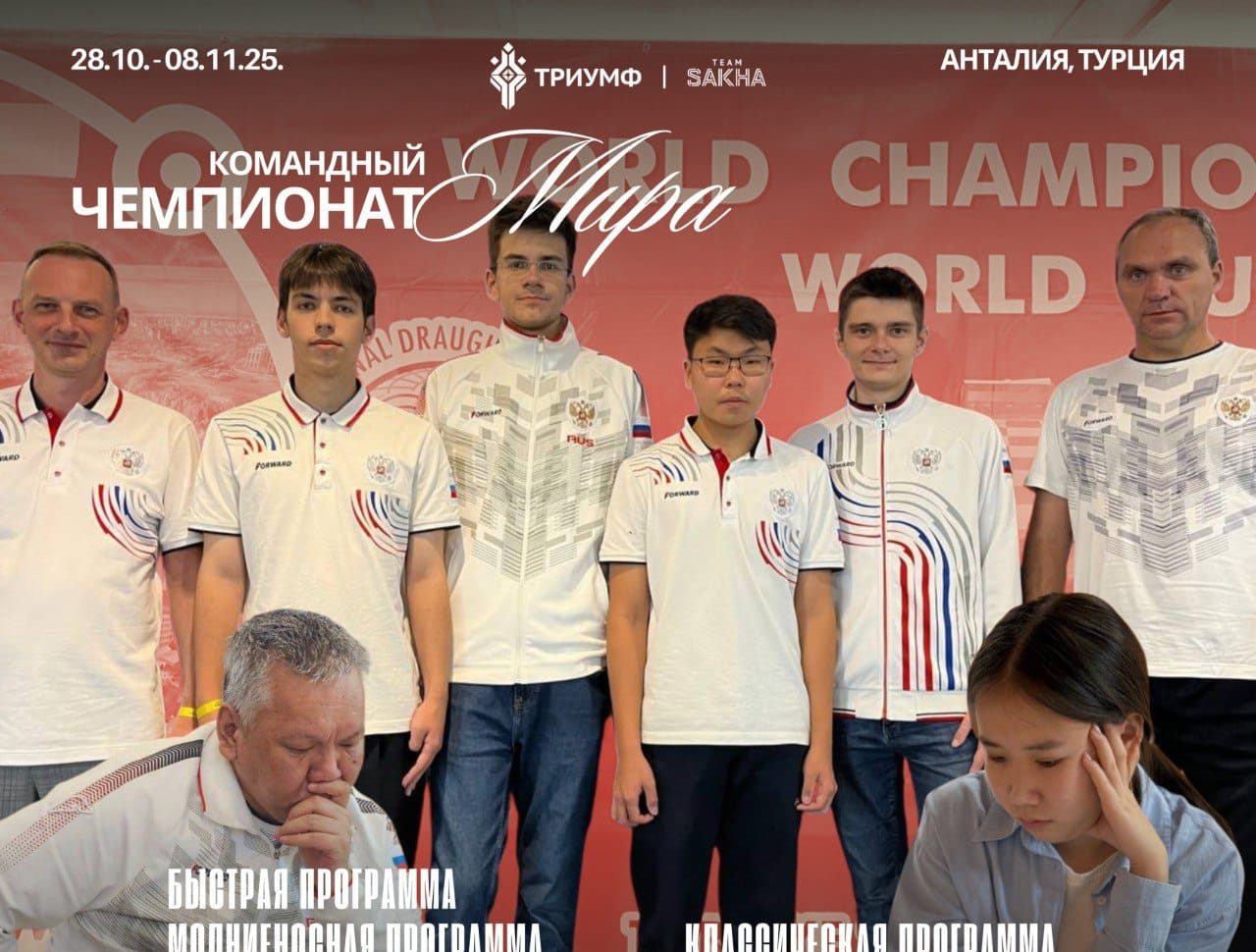 В турецкой Анталии проходит чемпионат мира по шашкам-64. Сборная России, в состав которой входят спортсмены из Якутии, одержала победу в командном зачёте. В личных дисциплинах классической программы золото завоевала Юлия Никанорова, в быстрой игре победил Гаврил Колесов, а в молниеносной — Айсен Егоров.
