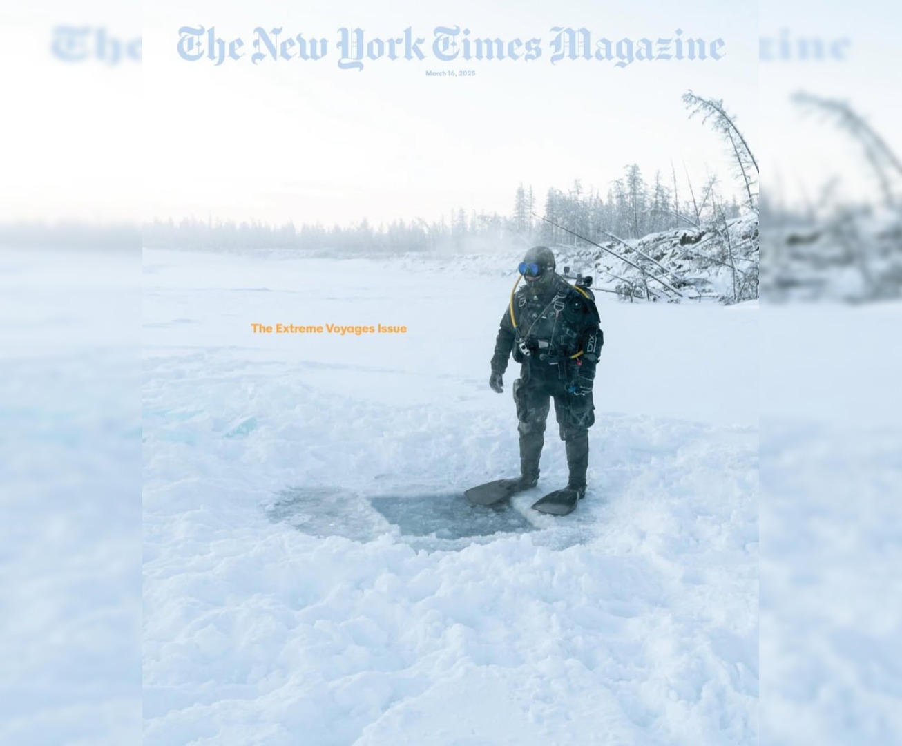 Фотография дайвера и охотника за бивнями мамонта из Якутии Егора Васильева украсила обложку мартовского номера журнала The New York Times. Автор работы — Евгения Арбугаева.