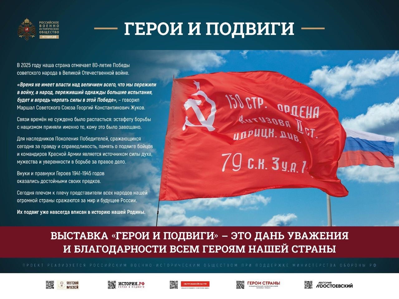 Историко-просветительский проект «Герои и подвиги», посвящённый героям нашего Отечества – участникам Великой Отечественной войны и специальной военной операции – реализуется РВИО с 2022 года. Главная его цель – сохранение исторической памяти, популяризация знаний о героизме защитников Отечества прошлого и настоящего, поддержка семей героев. За это время в Москве было открыто 5 фотовыставок. При участии Региональных отделений РВИО инициатива была подхвачена и в регионах: в 2025 году выставки были открыты в Калуге, Симферополе, Севастополе, Волгограде, Республике Хакасия, Республике Тыва.