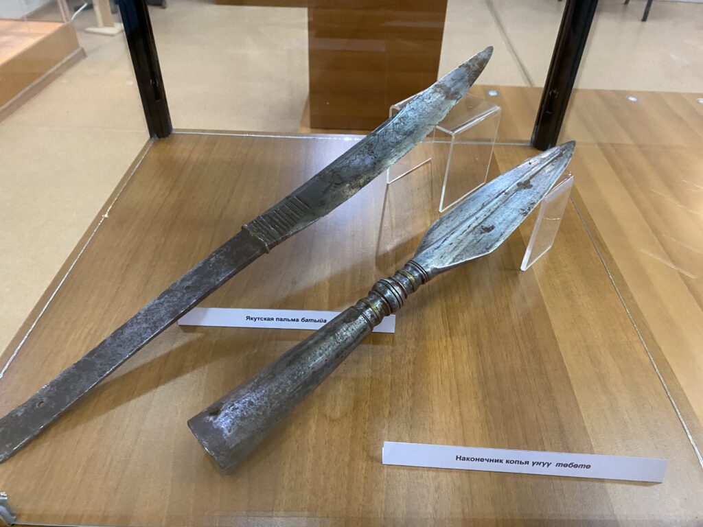 Особое место в экспозиции занимают якутские ножи и хомусы, а кроме того, представлены лучшие работы мастера – манекен якутского воина XVI-XVII веков, якутские сложносоставные луки, струнно-смычковые музыкальные инструменты и другие интересные экспонаты.