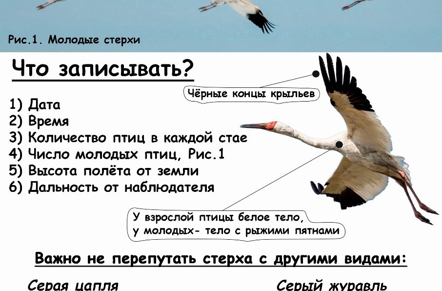 Информация о встречах с мигрирующими стерхами будет собираться из всех районов республики. Каждый житель, который увидит стерхов, сможет сообщить об этом, заполнив специальную анкету. Это поможет ученым получить ценную информацию о маршрутах миграции и состоянии популяции этих птиц. Анкета для наблюдателей разработана таким образом, чтобы собрать максимально полную информацию о каждом наблюдении. Она будет включать в себя следующие пункты: дата, время суток, местонахождение (точное указание местности и участка), количество увиденных стерхов, примерное расстояние от наблюдателя до птиц и наличие фото- или видеофиксации. Если у вас не будет возможности заполнить анкету, вы можете фиксировать свои наблюдения любым удобным для вас способом. Главное — зафиксировать информацию о стерхах, чтобы мы могли использовать ваши данные для мониторинга! (По ссылке вы найдете памятку по обнаружению стерхов и сможете скачать анкету для заполнения).